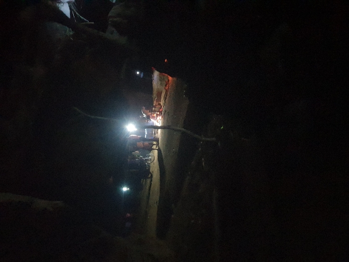 At night, a group of figures gathers around a brightly lit area. Some appear to be working, possibly using tools that emit sparks. The scene is dimly lit with several bright light sources. The surroundings are dark, obscuring details beyond the immediate illuminated space. A branch is visible in the foreground. The atmosphere suggests a work site or an emergency situation.