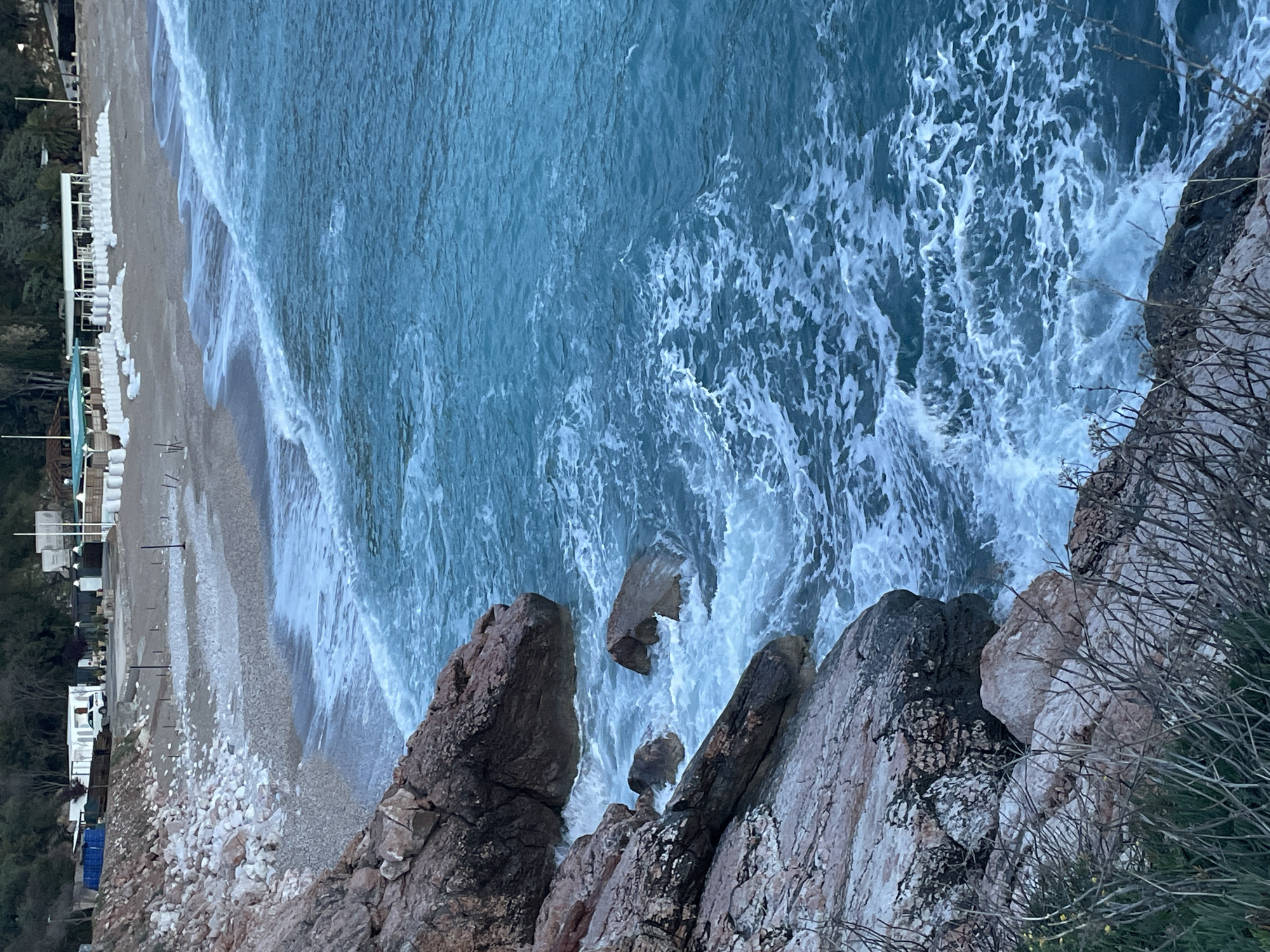 The image depicts an aerial-to-oblique view of the coastline at Kamenovo, Montenegro, during daylight hours. The scene is dominated by a rocky foreground on the left, characterized by reddish-brown and grey stratified rock formations with sparse, dry brush and patches of green vegetation. Waves of turquoise-blue water crash against these rocks, generating white foam. In the midground, the calm, deep blue sea extends towards a curving sandy and pebbly beach. Multiple white-foamed wave lines are visible breaking near the shore and receding. The background features the sandy beach lined with numerous white, cylindrical objects, likely large cushions or sandbags, arranged in rows, particularly on the right side. Behind the beach, several structures are present: a white building with a blue tarp or container nearby and a white passenger vehicle parked in front of it on the left. Further right, a larger white-framed structure with an open, covered area, possibly a commercial establishment, is visible. The area behind the structures is densely covered with green trees and foliage, indicative of a hillside. No individuals are visible within the frame.