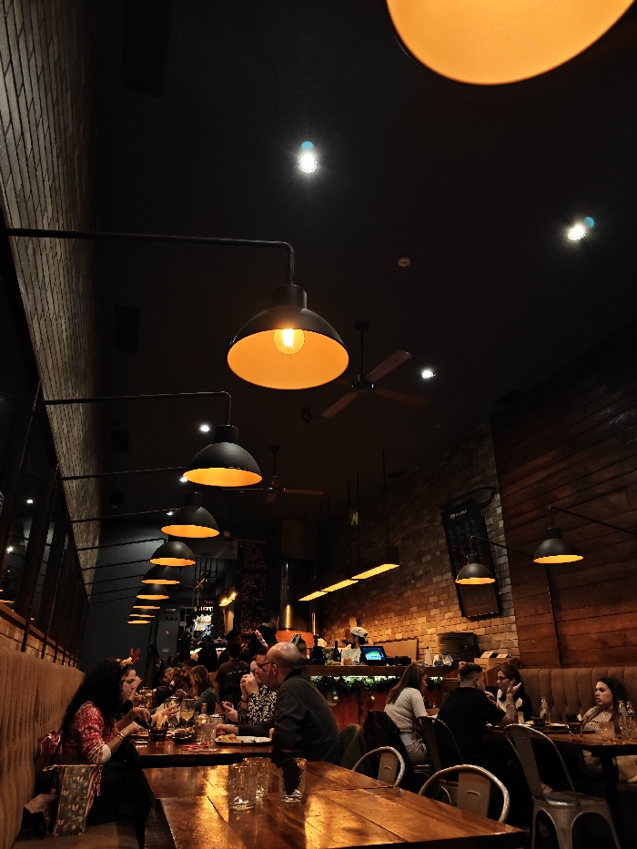 A dimly lit restaurant scene shows people seated at tables, enjoying their meals. The warm glow of overhead pendant lights illuminates the tables, reflecting off the wooden surfaces. Exposed brick and wood paneling add to the restaurant's rustic ambiance. A bar area is visible in the background, bustling with activity. The overall atmosphere is lively and inviting.