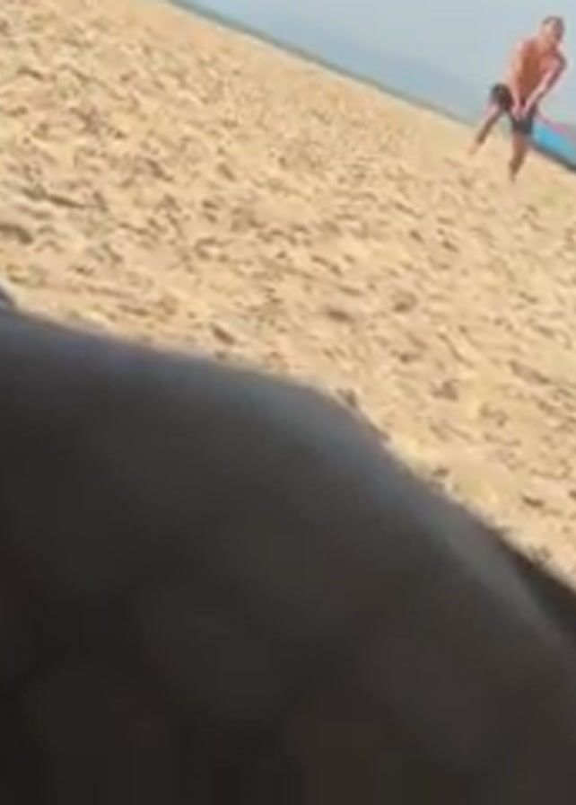From a first-person perspective inside a vehicle, a shirtless man in dark shorts runs across a sandy beach toward a light blue boat