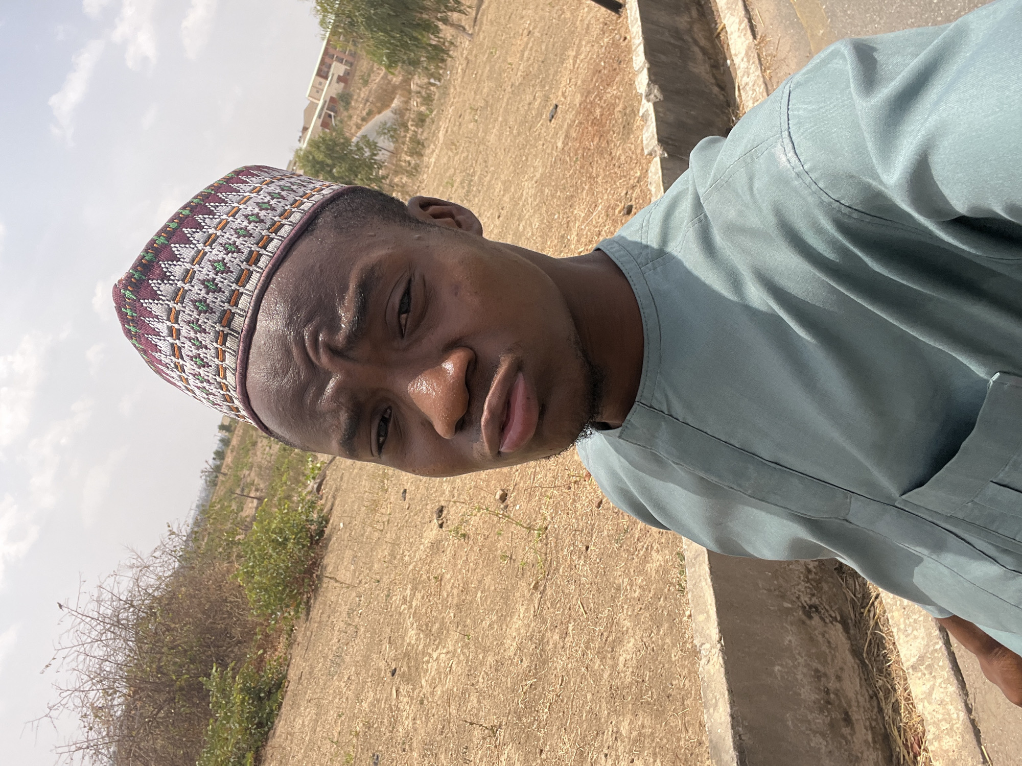 A young adult male, of dark complexion, is depicted in a close-up, high-angle selfie. He wears a light blue-green traditional tunic and a patterned cap featuring geometric designs in maroon, white, green, and orange. His expression includes pursed lips and slightly furrowed eyebrows, and sweat is visible on his forehead. The background reveals an outdoor environment under a bright, cloudy sky. Directly behind the subject is a concrete barrier, beyond which lies dry, light brown earth with sparse, parched vegetation and some small green shrubs. In the far distance on the right, several light-colored buildings with red roofs are visible on an elevated terrain. The scene is located in the city of Baganakwo, Nigeria.