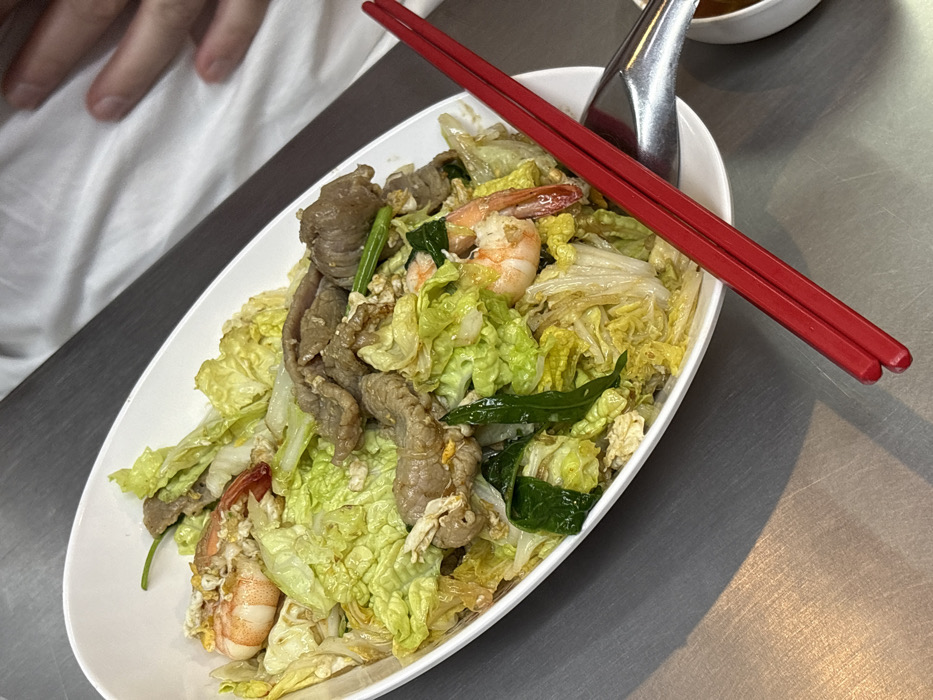 The image depicts a meal served in Suthep, Thailand. A large, oval white bowl occupies the center, filled with a stir-fried dish. The dish contains abundant light green and white Napa cabbage, slices of cooked meat, several cooked pink-orange shrimp with visible tails, and fragments of scrambled egg. Darker green leafy vegetables are also mixed within the ingredients. A pair of bright red chopsticks rests diagonally across the upper right edge of the bowl. To the immediate right, a silver-colored spoon and a partially visible small white bowl, likely containing sauce, are present. All items are placed on a brushed metallic surface. In the upper right background, a light-skinned human hand is partially visible against a white fabric background.