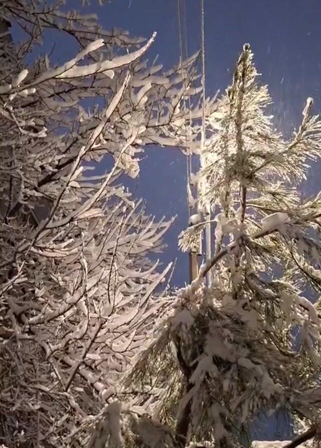 The video depicts a winter scene at night. Snow covers tree branches, contrasting against the dark blue sky. A streetlight illuminates the scene, making the falling snow visible. A power pole and wires are also visible among the trees.
