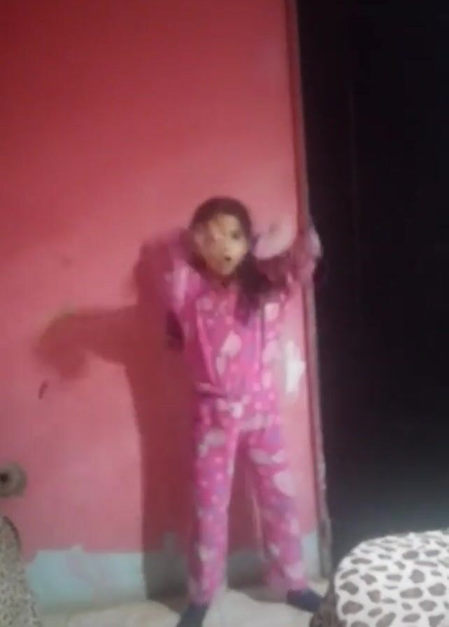 A young girl in pink pajamas dances in front of a pink wall with a tiled floor. Her hair is in pigtails, and she moves her arms up and down, crouching at times. A bed with a leopard print cover can be seen to the right.