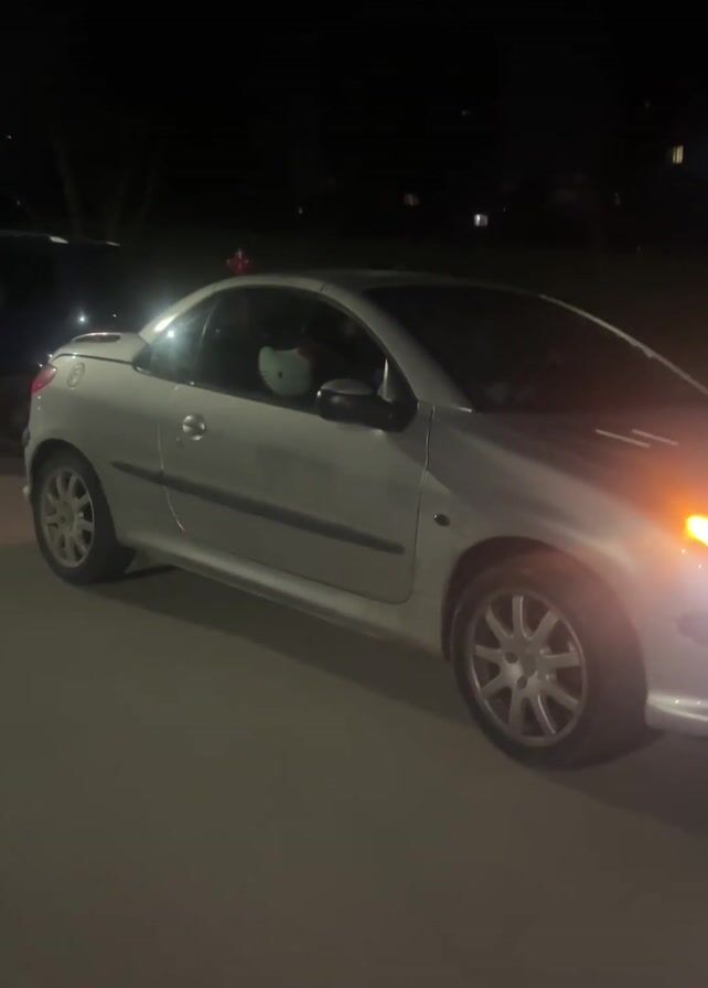 At night, a silver Peugeot 206 CC convertible accelerates away from the camera