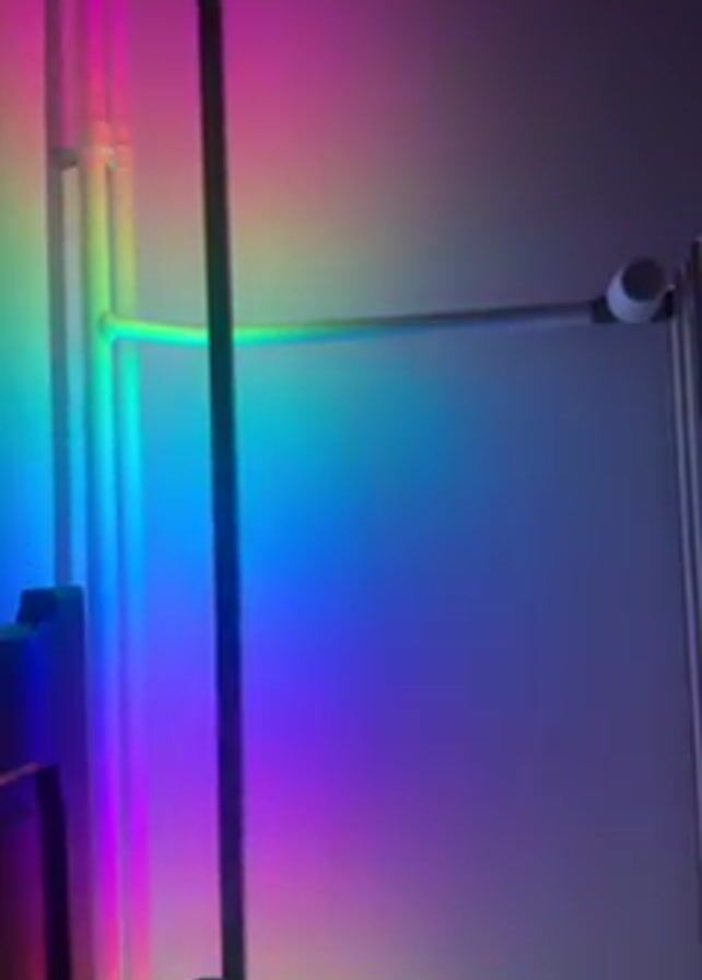 A static indoor shot features a black rectangular floor lamp positioned near a white wall and a white metal structure with horizontal bars. The wall displays a dynamic, rainbow-colored gradient light effect, shifting through hues of pink, purple, blue, green, and yellow. The lamp stands vertically, contrasting with the vibrant background. Part of a bed is visible in the lower portion of the frame.