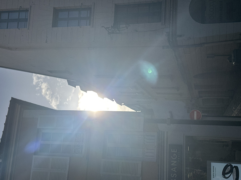 An upward-angled view captures a narrow, cobblestone street between two multi-story buildings in Saint-Germain-en-Laye, France. The sun, positioned low and centrally between the building facades, produces significant lens flare and backlighting, obscuring details. On the left, a light-colored building features multiple windows with white louvered shutters, some closed, and wrought-iron balconies. The ground floor houses a commercial establishment, identifiable by the partial sign "DESSANGE PARIS" and a display showing "SUBTIL REGARD". On the right, a lighter-toned building displays multiple dark-framed windows and an ornate black lantern affixed to its upper section. The ground level reveals a partially visible sign reading "Galaxy Imprimerie" above an arched entry. A dark pole stands in the foreground, partially obscuring the left building and displaying a red circular "No Entry" (sens interdit) sign directed down the street. The cobblestone street descends away from the viewer. No individuals or vehicles are present in the scene. The sky, visible between the buildings, contains scattered clouds.