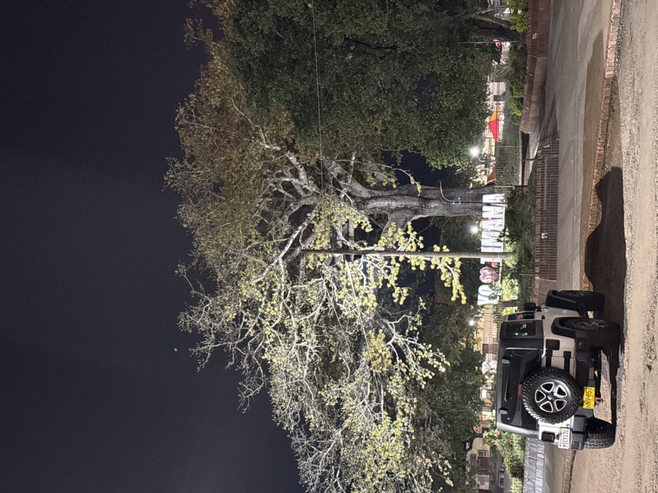 The image depicts a nighttime scene in Timaná, Colombia, specifically in a public park or plaza, indicated by the illuminated "YO ❤️ TIMANÁ" sign. In the foreground, a white two-door Jeep Wrangler, license plate HNV-857, is parked on a dirt surface. The vehicle has a black hardtop and a spare tire mounted on the rear. Adjacent to the Jeep, a mound of dark earth or debris rests on the ground. A brick-lined planter or curb separates the dirt area from a paved pathway leading into the park. Dominating the midground is a large, mature tree with light-green foliage, illuminated by artificial light, and a street light pole positioned in front of its trunk. To the right of this tree, another large tree with dense dark green foliage is visible. The background reveals additional park features, including faint lighting and a red and white striped canopy or umbrella structure on the far right. The sky is dark, with a faint crescent moon visible in the upper left quadrant. No individuals are present in the scene.