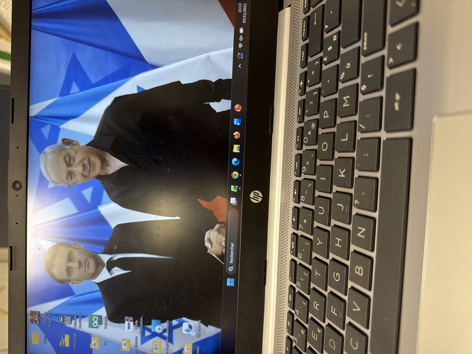 An HP laptop, featuring a silver chassis and dark grey QWERTY keyboard with French localized characters, is depicted in a close-up, angled view. The laptop is positioned on an unidentifiable surface, likely a desk, in Schiltigheim, France. Its screen displays a desktop wallpaper featuring a composite image of two male figures: Emmanuel Macron, in a dark suit, on the left, shaking hands with Benjamin Netanyahu, in a black collared shirt, on the right. Multiple Israeli flags serve as the background for the handshake. The Windows 11 taskbar is visible at the bottom of the screen, containing a centered search bar labeled "Rechercher," several pinned application icons including web browsers and productivity software, and system tray icons indicating Wi-Fi, battery, audio, and the date and time as 07/11/2025, 11:13. Various desktop shortcut icons are visible on the left side of the screen. The screen exhibits visible reflections from an overhead light source and surface smudges. A small webcam lens is situated at the top center of the screen's bezel.