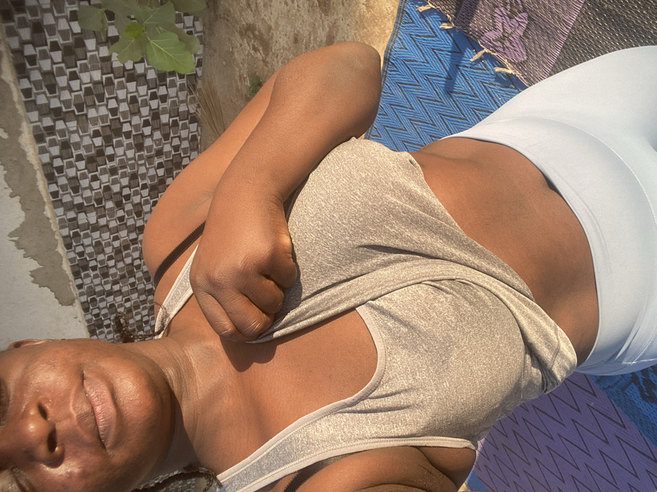 A dark-skinned woman lies on a colorful mat, possibly after a workout. She wears light blue leggings and a light grey tank top. One arm is bent across her chest, with her hand slightly clenched. The background includes a patterned wall and a green plant. The sunlight is bright, casting shadows on the woman's face and body. The image is taken from a slightly elevated, angled perspective.