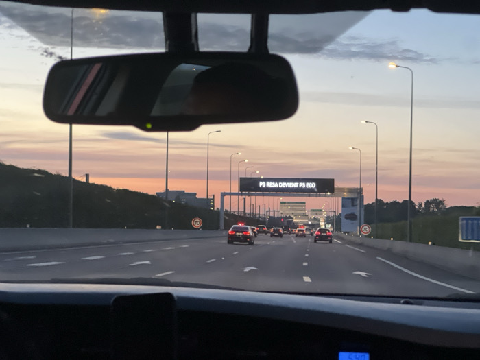- "The image provides a forensic view from inside a vehicle, looking forward through its windshield at a multi-lane highway at twilight, characterized by an orange, pink, and blue sky" by FM-t80Kg1, licensed under CC BY 4.0