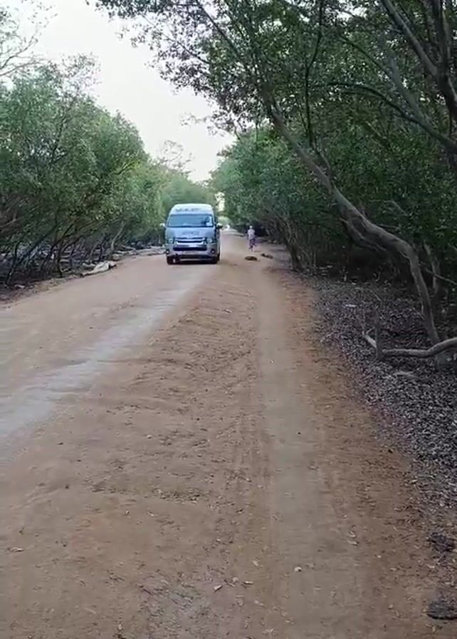 straight, dirt road lined with trees on either side. In the distance, a silver van drives toward the camera. A person walks away from the camera and toward the van in the middle of the road. The trees are green and thick, creating a canopy over the road. The ground is dry and dusty. The sky is overcast.