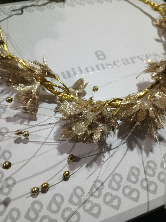 A close-up shows a golden flower crown resting on a white surface. The crown features fabric flower accents and small golden beads attached to thin, transparent strands. The surface has a subtle grey pattern of repeated "S" shapes and the text "buttonscarves" is faintly visible, suggesting the crown is displayed on its packaging.