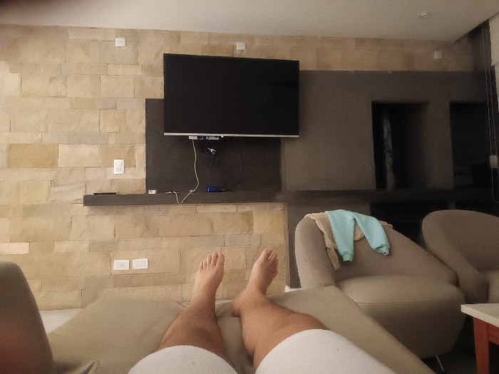 An interior shot depicts a room, likely a hotel or private residence, in Unknown, Argentina. The perspective is from a reclining individual whose bare legs and feet, clad in white shorts or underwear, are prominent in the lower foreground. The individual is positioned on a light beige upholstered surface. Directly ahead, a large, dark-screened flat-panel television is mounted on a dark grey wall section. Below the television, a dark floating shelf holds white cables and a small blue electronic device. To the left of the television, the wall is composed of rectangular, light beige stone or tile cladding, featuring multiple white electrical outlets. To the right, two light beige upholstered armchairs are visible. A light blue and a tan garment are draped over the armrest of the closest armchair. A partial view of a small table with a white surface and reddish-orange legs is present to the far right. The background wall section is dark grey, incorporating two recessed alcoves, with a continuation of the light stone cladding above. The ceiling is white.
