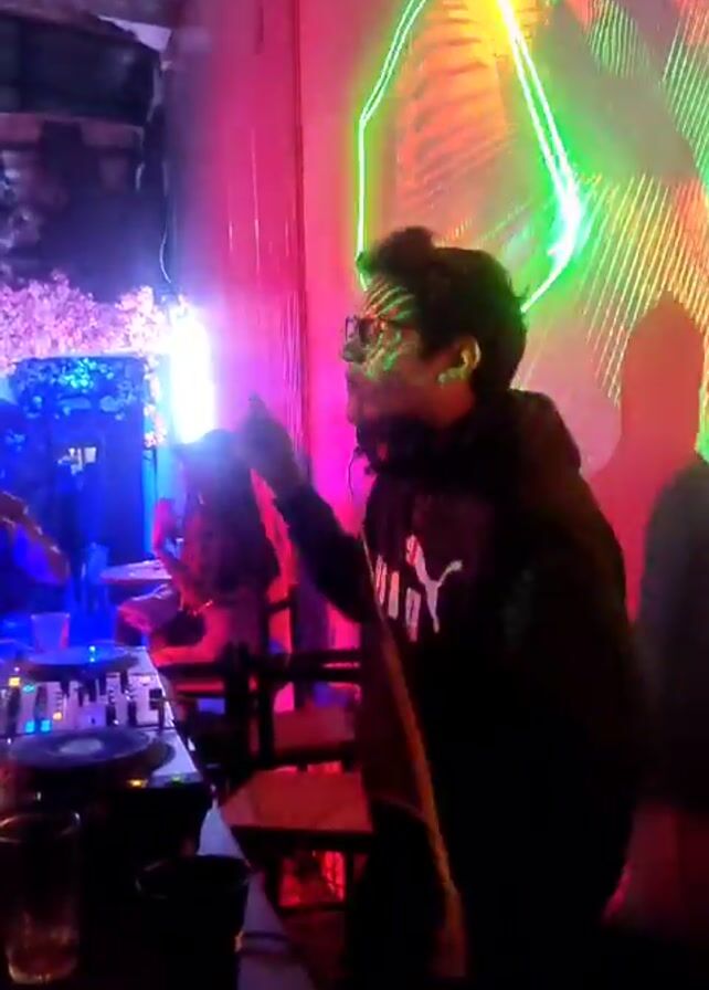 A DJ wearing glasses and a black Puma hoodie performs at what appears to be a club or lounge with colorful lighting