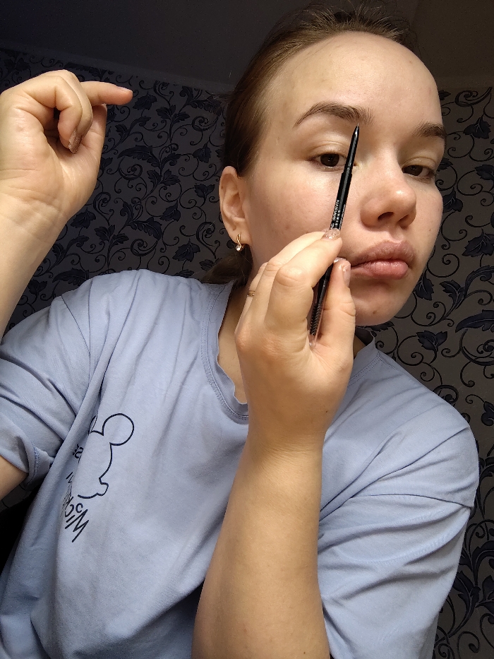 A person applies eyebrow makeup using a black pencil. The person wears a light blue t-shirt with a Mickey Mouse graphic and a small gold earring. The background is a floral wallpaper pattern. The individual is fair-skinned with light brown eyebrows, facing the camera directly with focused expression.