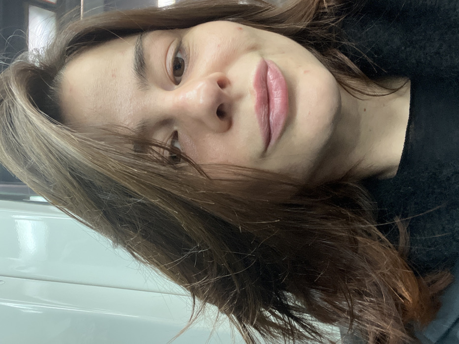 A woman with light skin and brown hair takes a selfie. Her head is tilted to the left. She has brown eyes, full lips, and her hair is parted to the side, falling across her face and shoulder. She appears to be wearing a black sweater or jacket. The background is blurry and includes what looks like a white wall or surface.