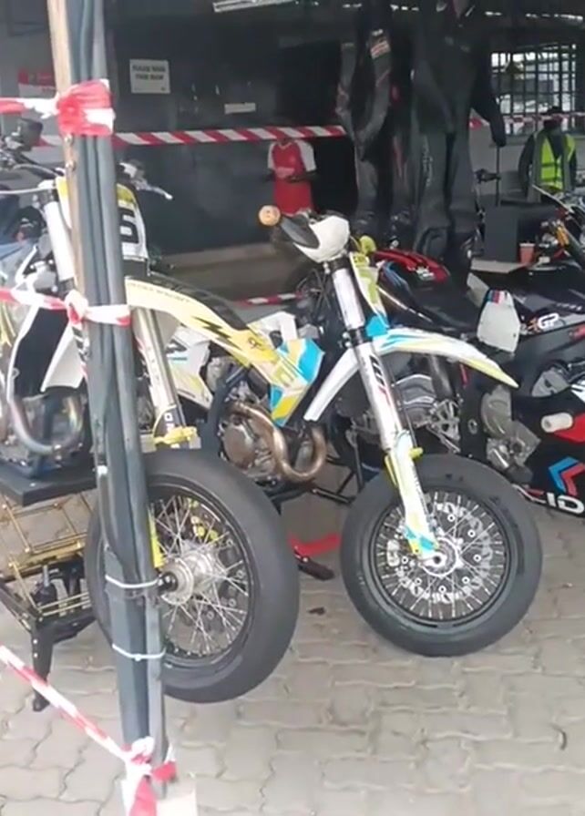 line of motorcycles parked under a covered area. The camera pans from left to right, showcasing several bikes in detail. The motorcycles vary in design and color, including white, yellow, black, red, and green. Some bikes have visible racing numbers and logos. Racks and stands support the motorcycles. In the background, people stand around, some wearing safety vests. Motorcycle gear, including leather suits, hangs from the roof. The ground is paved.