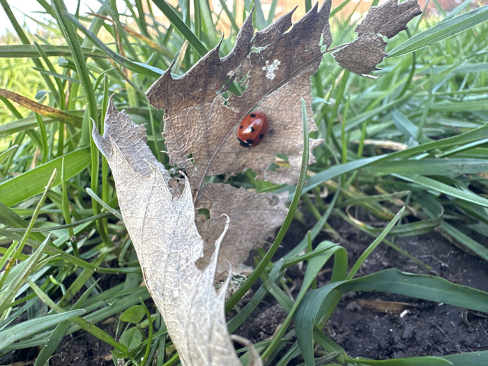 The image presents a macro-level, low-angle view of a natural ground environment, situated in Macclesfield, United Kingdom. A single red ladybug, approximately 5-7mm in length, with multiple black spots on its elytra, is positioned on a desiccated, brown, and partially disintegrated leaf. The leaf exhibits a prominent vein structure and ragged edges, with significant portions of its lamina missing, creating a skeletal appearance. Small, irregular white deposits are visible on the surface of the leaf. This decaying leaf is partially obscured by and interspersed with various blades of vibrant green grass. Dark, moist soil is visible between the vegetation and beneath the leaf. The background consists of out-of-focus green and brown tones, indicative of further natural vegetation or distant ground features. No human subjects, animals other than the ladybug, or man-made objects are discernible within the frame. The ladybug appears stationary on the leaf.