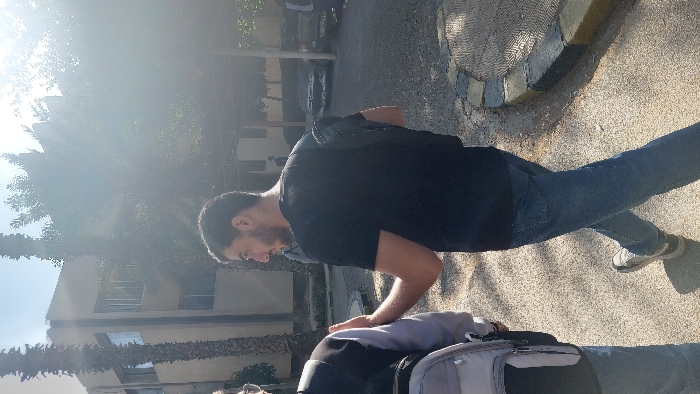 An outdoor scene in Ash-Shaghour Municipality, Syria, depicts two individuals walking on a textured paved surface under bright sunlight. In the mid-ground, a young adult male is visible from the waist up, facing mostly away from the camera, looking left. He has dark hair, a beard, and wears a black t-shirt, blue jeans, and light-colored sneakers. A black backpack is slung over his left shoulder. His right hand is raised, positioned near the left shoulder of a second individual, partially visible on the far left. This second individual wears a light grey top and blue jeans, with a light grey and black backpack. The paved ground features a curved curb on the right, painted with alternating yellow and black stripes. In the background, a two-story tan building with multiple windows is visible on the left, partially obscured by two palm trees. Other leafy trees and vegetation are scattered across the background, with significant sun glare originating from the upper right of the frame. Faint outlines of parked vehicles are visible in the far right background, under some form of partial cover.