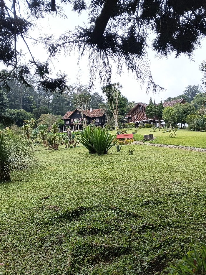 The image depicts a lush, landscaped environment in the city of Munyati, Zimbabwe, under an overcast sky. In the foreground, dark, out-of-focus conifer branches hang from the top of the frame. The ground is covered by extensive, manicured green grass and ground cover. Scattered across the lawn are various spiky, succulent-like plants and small bushes of differing sizes. A light-colored, narrow path or series of stepping stones curves from the mid-ground towards the right. To the right of this path, a red slatted park bench is visible, alongside a cut tree stump. In the background, three multi-story buildings with dark brown or black timber-framed facades and reddish-brown tiled roofs are nestled among numerous trees. The buildings feature multiple windows, some with dark shutters, and one on the far left has a prominent white chimney. The architectural style appears rustic or lodge-like. A dense forest or wooded area forms the horizon behind the buildings, indicating a heavily vegetated locale. No individuals or discernible actions are present in the scene.