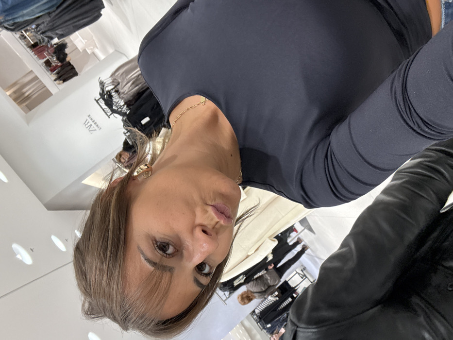 A woman with brown hair and bangs poses in a clothing store. She wears a dark long-sleeved top and gold jewelry. Racks of clothing and other shoppers are visible in the background. The store is well-lit with white walls and bright lights. A black leather jacket is partially visible in the foreground. The photo is taken at an unusual angle, with the camera positioned low and to the side of the subject.