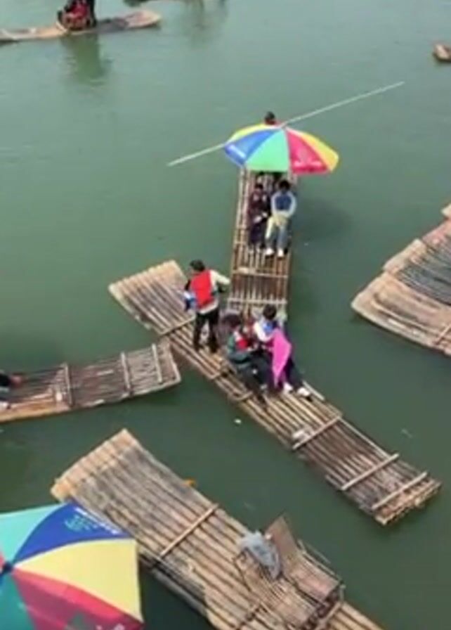 A high-angle shot shows several bamboo rafts on a body of water that seems to be a river