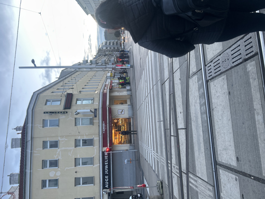 The image captures an urban street intersection in Vienna, Austria, specifically at Roseggergasse 16, within the 16th district (Ottakring), indicated by a street sign on a corner building. The scene is observed likely in the late afternoon or early evening under an overcast sky, with artificial lights illuminating storefronts and streets. In the foreground, the back of an individual, dressed in a dark quilted jacket with a black backpack, is visible on the right, facing away from the camera and towards the street. Multiple tram tracks are embedded in the concrete paving directly in front of the viewer, leading to a prominent white-striped pedestrian crosswalk. The midground is dominated by a light-yellow, multi-story corner building. Its ground floor hosts an "ANKER" bakery, brightly lit and displaying various baked goods, where a single male figure stands inside near the window. To the bakery's left, an "AUGE JUWELIER" storefront is present, secured by a lowered metal shutter. Vertically mounted on the building's corner is a sign reading "POLLMANN," with a street sign indicating "16, Roseggergasse" beneath it. Further down the street to the right of the bakery, a group of approximately five people, some wearing high-visibility yellow or green jackets, are gathered on the sidewalk. Beyond them, an emergency vehicle with active flashing lights is visible among other distant vehicles on the street. A tall street light pole stands on the right side of the road. The background shows additional multi-story buildings lining the streets under a cloudy sky.