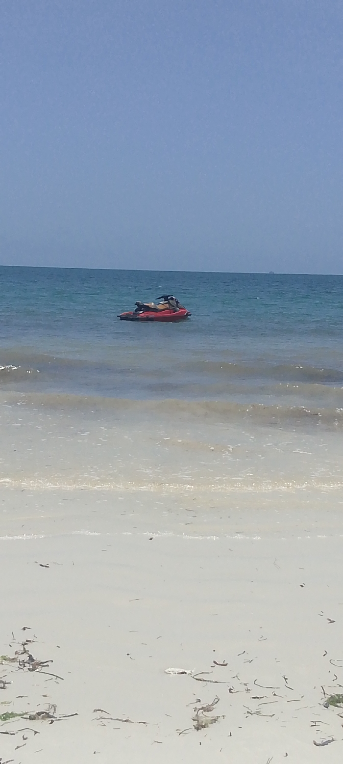 The image displays a coastal environment in Mkomani ward, Kenya, under a clear, light blue sky. A red personal watercraft (jet ski) is observed floating in the turquoise ocean water, approximately 20 meters from the shoreline. Two individuals are seated on the jet ski; one in the operator's position and a second directly behind. Both individuals are dressed in dark-colored attire. The jet ski appears to be stationary or moving at a very slow speed, as no significant wake is visible. The foreground consists of a light-colored sandy beach, wet at the waterline from minor wave activity, and scattered with dark, stringy organic debris. A faint, dark, indistinct object is discernible on the distant horizon line within the ocean.