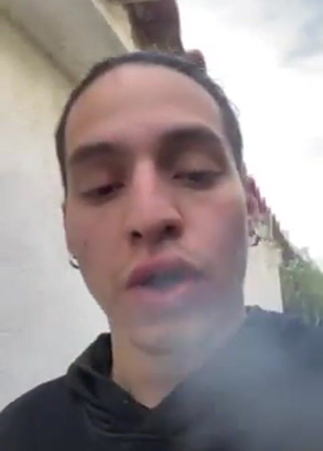A young adult male with long dark hair pulled back, wearing a black hoodie, is filming a selfie video outdoors