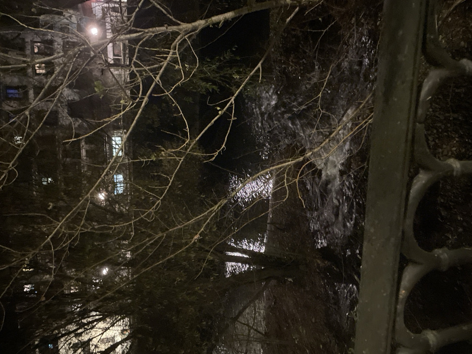 A nighttime shot focuses on a dark, rushing river. Bare tree branches fill the foreground, their reflections distorted in the water's surface. A building with lit windows is visible in the background, also reflecting in the water. A section of a wrought iron fence is seen on the right side of the frame, adding a structured element to the otherwise natural scene. The scene has a melancholic mood due to the darkness and blurry images.
