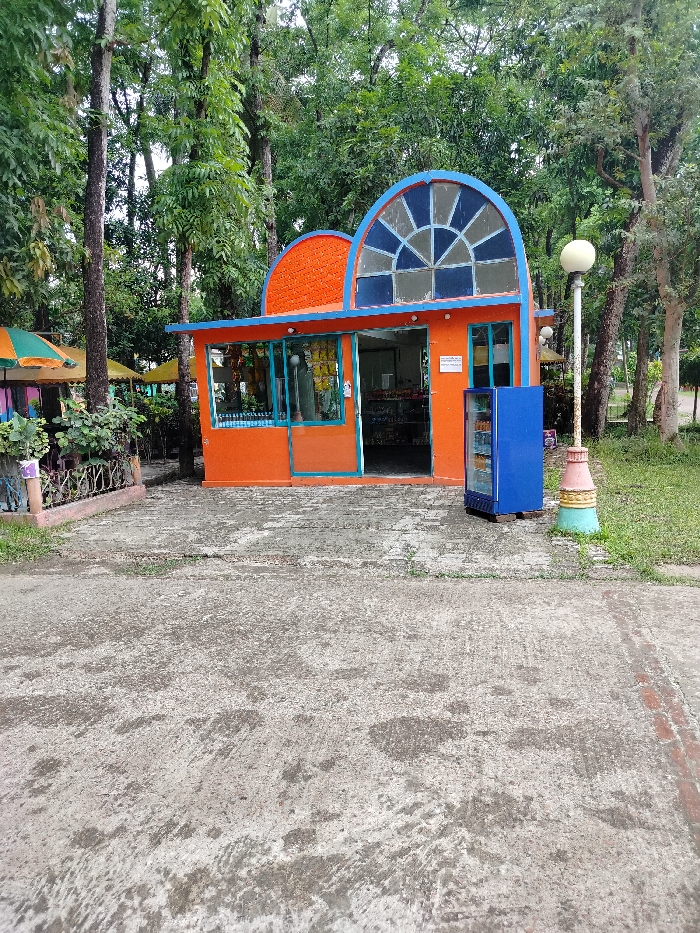 small, brightly colored shop in a park in the city of Barishal, Bangladesh. The shop is painted orange and blue, with a large arched window in the front. The shop has a single door and is open to the public. The shop is located in a park setting, with trees and green grass. There is a single, blue refrigerator outside the shop, and a light pole with an orange and blue base. There are no people in the image. The shop appears to be a small convenience store or snack stand. The coordinates provided place the image in the vicinity of the Barishal University campus.