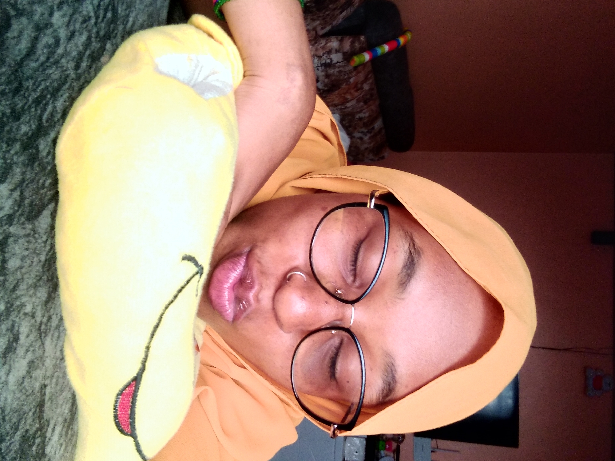 A person wearing an orange hijab and round eyeglasses is seen in the photo. They are holding a yellow plush toy with a white patch and a red detail on its side. The person has closed eyes and a nose ring. The background includes a wall painted in a reddish hue, and elements like a television and some objects on a table are visible. The location, Nyeri, Kenya is not discernible from this photo.