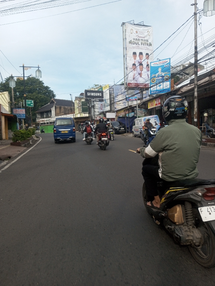 The image captures an urban street scene in Phonsavan, Laos, under an overcast sky. In the immediate foreground, an individual is observed from behind, riding a black and yellow Honda scooter. The rider wears a green jacket, black pants, and flip-flops, with a black helmet featuring multiple stickers. The rider's right hand extends to the side, holding a light-colored, narrow object. The scooter's rear license plate displays "F 413..." The asphalt road, appearing slightly damp, is occupied by various vehicles. Directly ahead of the foreground scooter, several motorcycles, each with a helmeted rider, are visible. Further down the road, a blue van is prominently positioned, followed by additional motorcycles, a white utility van, and a dark sport utility vehicle. The street is lined with commercial buildings on both sides, displaying various signs and banners. A dense network of overhead electrical and communication wires spans across the street. A large vertical billboard in the mid-distance prominently features "Selamat Hari Raya Idul Fitri" with a graphic of six men in white attire. Below this, another banner advertises "INDO LAUNDRY." Other visible signage includes "SAMSUNG," "OPPO CELL," and "BERRY CELL." On the left side of the road, decorative streetlights are present amidst green tree foliage. The environment suggests a busy commercial district.