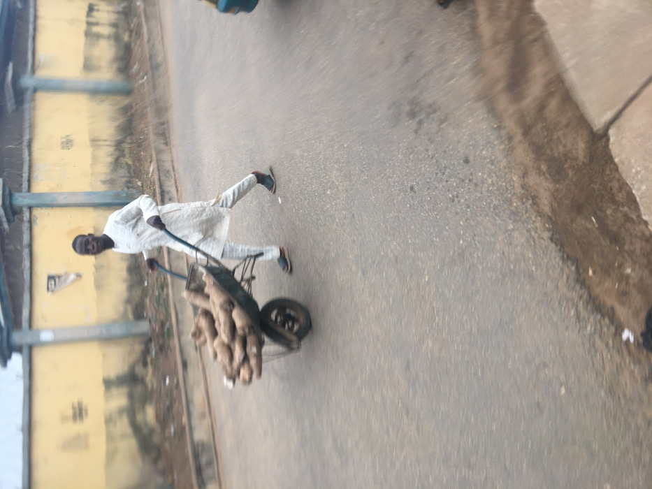 An outdoor scene captured in the city of Dadi Riba, Nigeria, features a male individual walking on an asphalt road. The man, positioned slightly left of center, wears a light-colored, long-sleeved garment with matching trousers and dark sandals. He is looking directly towards the viewer. He is actively pushing a dark metal wheelbarrow, which is heavily loaded with numerous elongated, brown, tuberous vegetables, consistent with yams. Motion blur around the wheelbarrow's single wheel suggests forward movement. The road surface is grey asphalt, with a concrete curb visible in the lower right foreground. In the background, a long yellow wall, showing signs of wear, discoloration, and faded markings, runs horizontally. Behind this wall, two light-colored concrete pillars are discernible, along with blurred green vegetation. A partial view of a light blue vehicle is visible on the far right mid-ground.