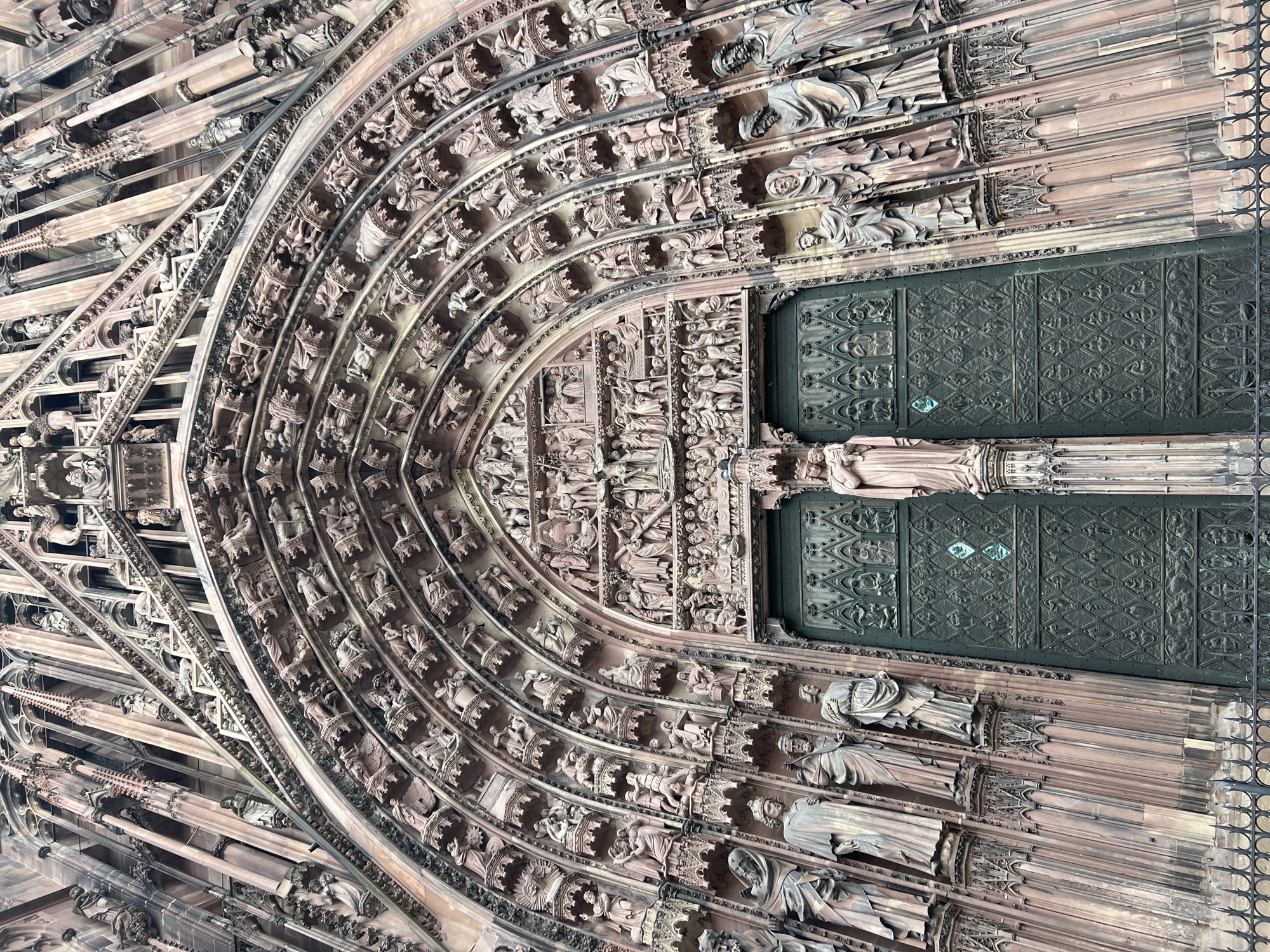 ornate, heavily sculpted facade of a gothic cathedral entrance. The location is likely Strasbourg Cathedral in Strasbourg, France, identifiable by its distinctive gothic architecture. The primary focus is the arched entrance, adorned with multiple layers of sculpted figures and decorative elements. These figures seem to depict religious scenes and characters. A set of imposing dark green doors with intricate geometrical patterns is visible at the center, flanked by vertical rows of sculpted statues. The architectural style is highly detailed and characteristic of late medieval gothic design. The environment suggests a large, monumental structure.