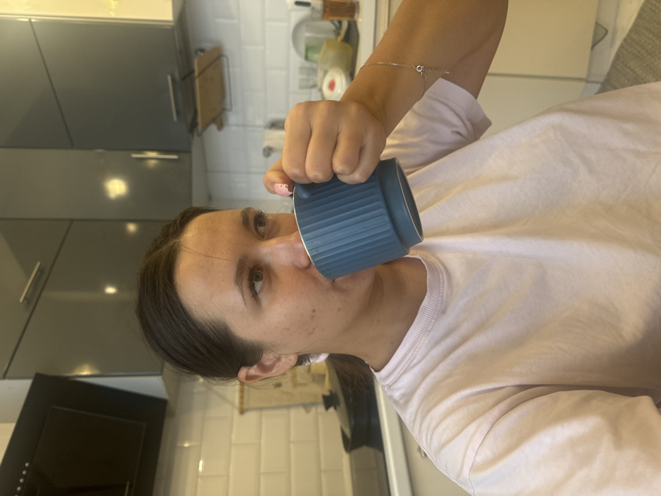 A woman with dark hair drinks from a blue, ridged mug in a kitchen. She wears a light pink t-shirt and a delicate bracelet. The kitchen features white tiled walls and gray cabinetry. An oven is visible below the counter. The photograph is taken at a slight angle, showing the woman's face and upper body.