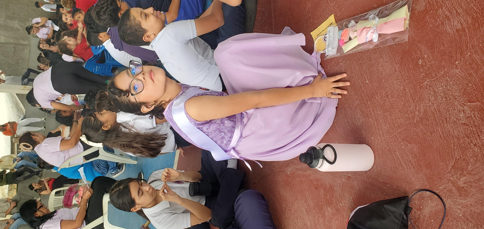 gathering of people, likely students and adults, indoors, in what appears to be a school or community center in Cabudare, Venezuela. The focal point is a young girl wearing a light purple dress and a white sash, indicating she may be recognized for an achievement. She is surrounded by other seated students and adults, who are in casual attire. On the ground near her, there is a pink water bottle, a black bag, and a plastic-wrapped package with what appear to be hair accessories. The room has a red floor and partially visible blue and white seating. People are seated, some looking up, possibly to engage in a conversation. Some seem to be occupied with their belongings.