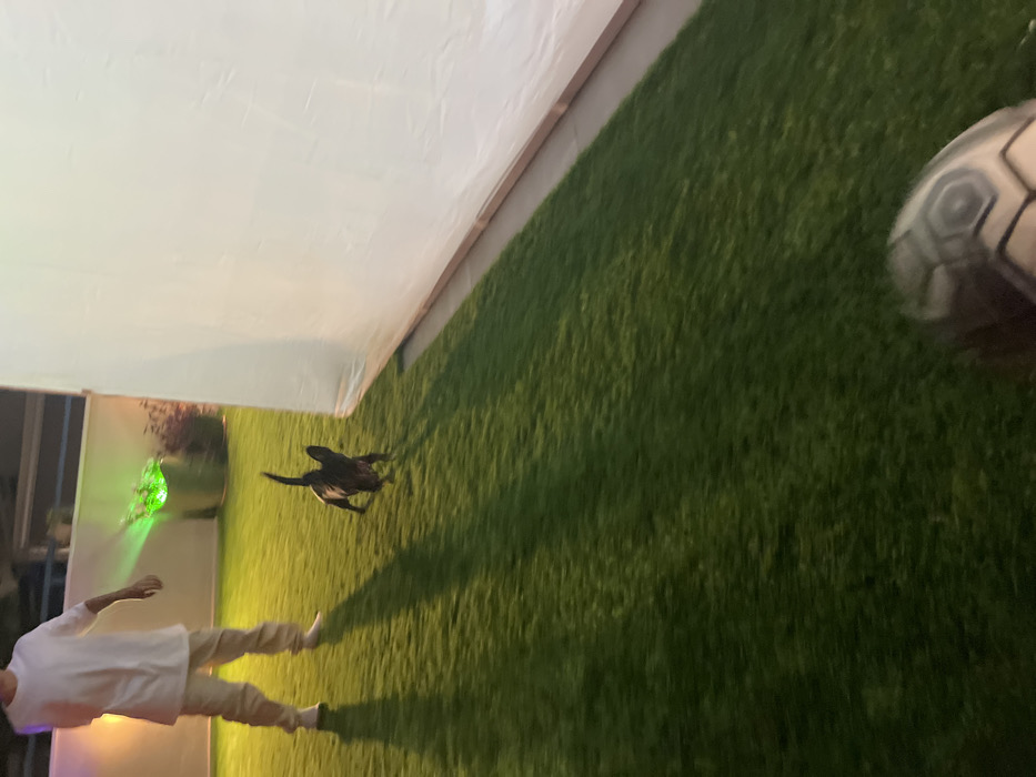 The image depicts an outdoor nighttime scene on artificial green grass in the city of Shoham, Israel. In the upper left quadrant, a person is partially visible, wearing a white t-shirt, light-colored baggy pants, and white socks, standing with arms at their sides, casting distinct long shadows to the right. A small, dark-colored dog, consistent with a French Bulldog, is captured in mid-stride, running from left to right across the grass, with its tail erect. A large, opaque white structure, resembling a temporary wall or partition, occupies the right side of the frame, extending vertically. In the background, behind the person, a low wall, two plant pots (one illuminated with green light), and a blurred building structure are visible. A geometrically patterned ball, possibly a soccer ball, is partially visible in the lower right foreground. Artificial lighting illuminates the entire scene.