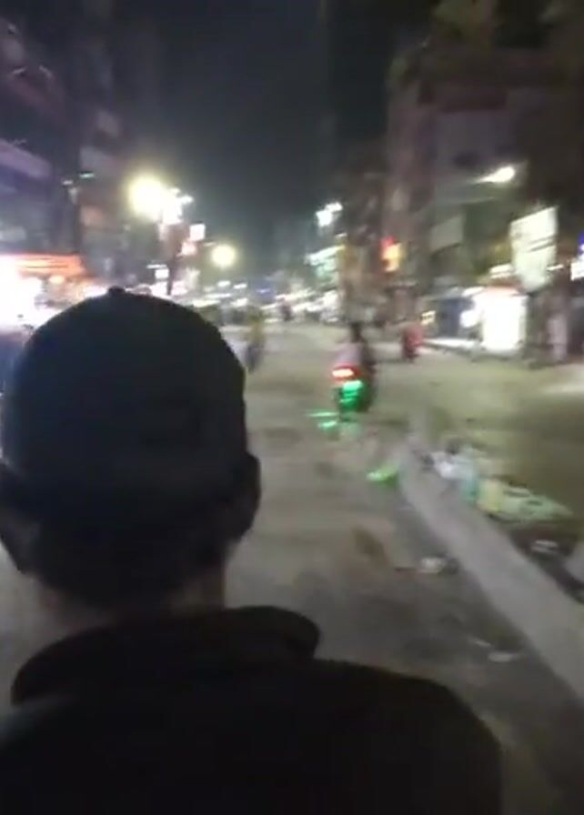 A person wearing a baseball cap is walking down a busy street at night. The street is lined with shops and buildings, and there are many people walking and riding motorbikes. The street is illuminated by streetlights and the lights from the shops. The ground is asphalt. The person is walking away from the camera. Other people are visible, walking or standing. There is also a rickshaw parked on the side of the street. The general impression is that this is a crowded, bustling street scene in a city, probably in South Asia, at night.