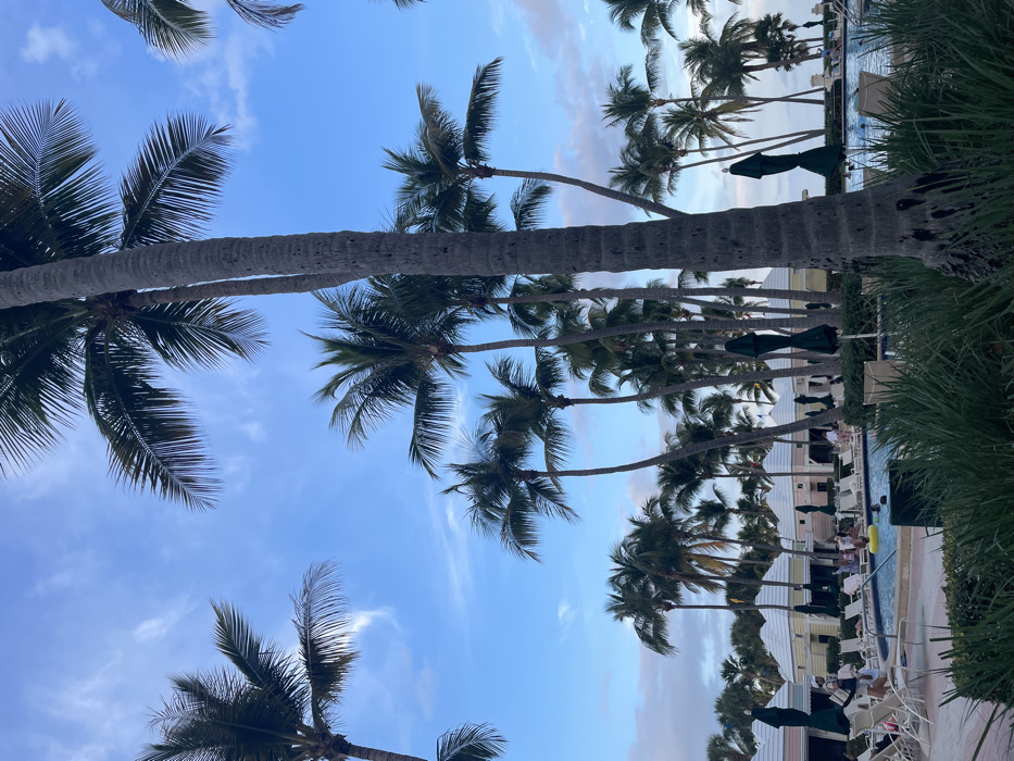 A sideways-oriented view reveals a tropical scene. Palm trees with full fronds dominate, framing a partly cloudy blue sky. A swimming pool, lined with chairs and umbrellas, sits adjacent to a building. Lush green foliage adds a natural border to the right. People populate the pool area, contributing to a relaxed, vacation-like atmosphere.