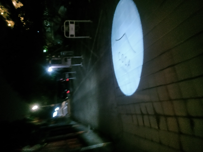 A nighttime scene depicts an outdoor paved walkway at Cosca Coffee & Eatery, located on Jl. Dr. Setiabudi No.249-251, Isola, Kec. Sukasari, Bandung City, Indonesia. In the foreground, a distinct circular light projection is cast onto the block-paved ground, revealing faint, inverted text spelling "COSCA" and a subtle design within its illuminated area. Rectangular shadows, likely from an adjacent fence or railing, traverse the left portion of the walkway. The pathway recedes into the background, where a single, tall streetlight illuminates the immediate vicinity. Further down the path, several blurred vehicles are present, including a light-colored van or sedan and a darker vehicle displaying illuminated red taillights. Multiple white, upright structures, resembling bollards or informational stands, are scattered on the right side of the path, with a prominent white U-shaped barrier visible closer to the center-right. No individuals are visible. The overall environment is dark, illuminated solely by artificial light sources from the streetlight, vehicle lights, and the ground projection.