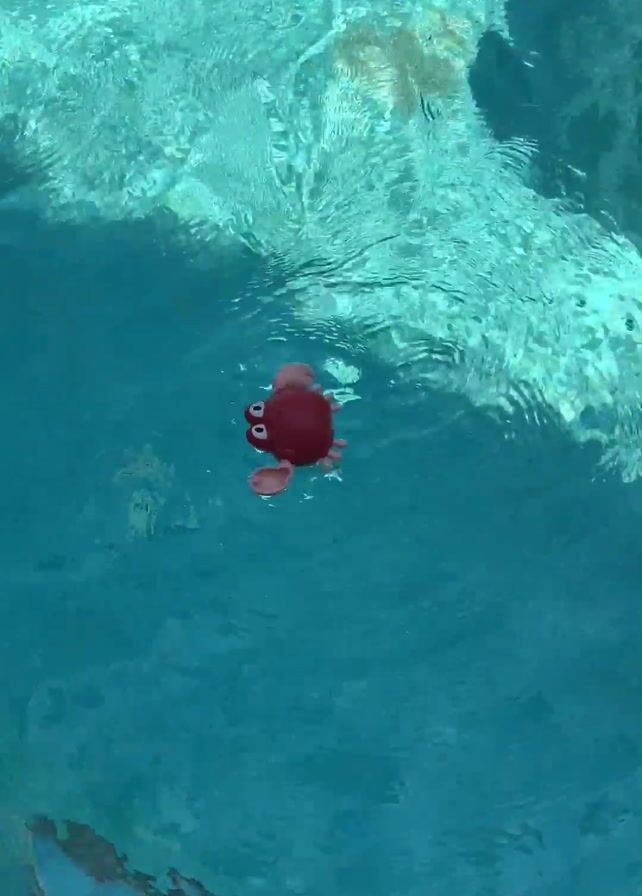 A top-down shot shows a red toy crab floating on the surface of a swimming pool