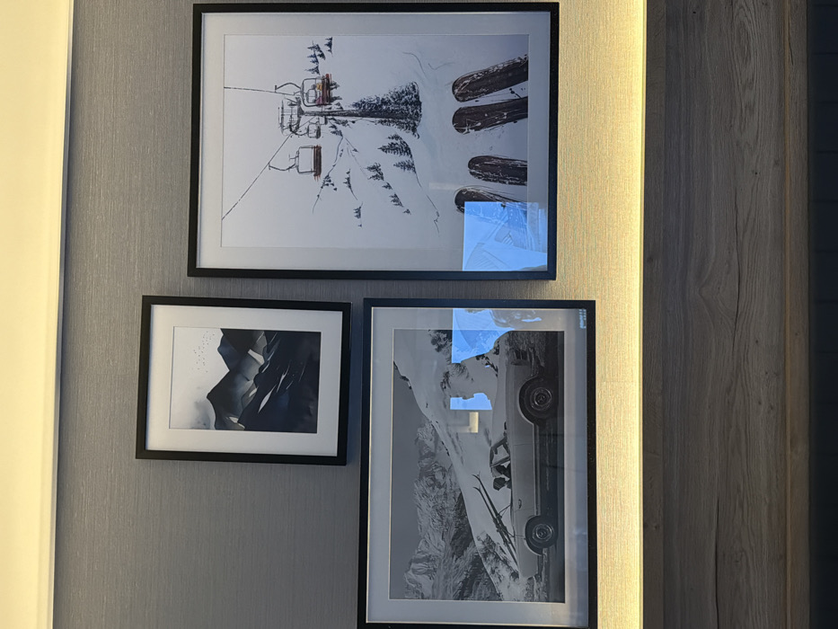 The image depicts a section of an interior wall in Bansko, Bulgaria, showcasing three framed artworks positioned above a light-colored wooden surface. The wall is covered in a grey, subtly textured material. A horizontal light strip illuminates the wall and frames from above. The frames are black. The smallest frame, positioned top-center, contains an abstract or minimalist artwork depicting several dark blue and grey mountain peaks under a lighter sky with small, silhouetted birds. Below this, on the bottom left, is a larger, horizontally oriented frame enclosing a black and white photograph. This photograph features a vintage convertible car, possibly a Mercedes-Benz SL, with two occupants. The car is driving on a road amidst a snow-covered mountain landscape, with skis strapped to its rear. To the right, a large, vertically oriented frame displays a stylized image or illustration of a snowy mountain scene. This artwork depicts a ski lift with multiple chairs, some occupied, against a predominantly white background with sparse evergreen trees. The foreground of this image shows the tips of several skis pointing upwards from a low perspective. Reflections with a blue tint are visible on the glass of the two lower frames. A second horizontal light strip illuminates the wooden surface directly beneath the frames.