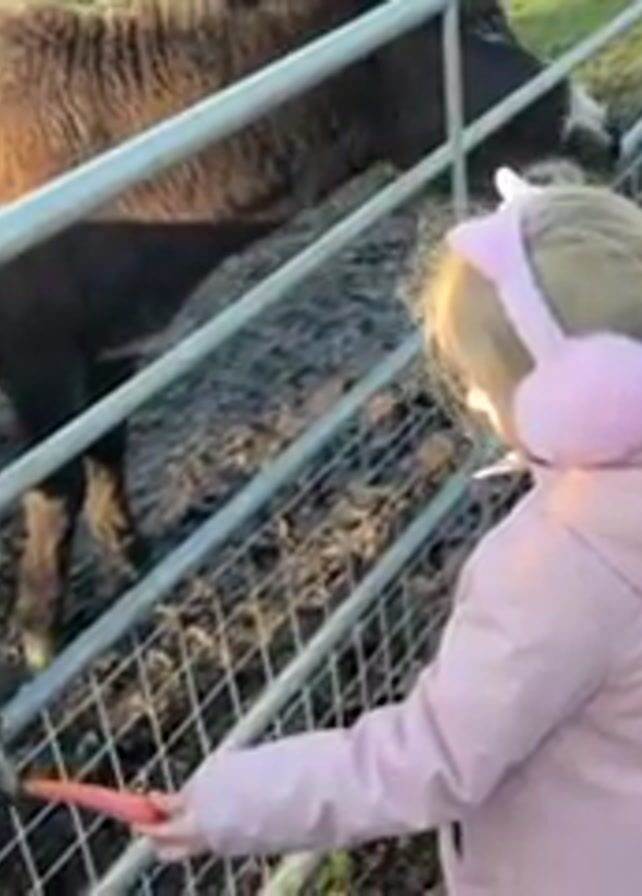 A young child in a pink coat and earmuffs holds a carrot out to a donkey through a metal fence