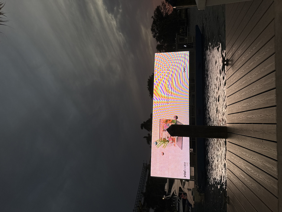 An outdoor advertising display shows a Dell XPS laptop with an Intel Core logo. The ad promotes "Introducing the new Dell XPS." The display is beside a body of water and a wooden deck. The sky above is dark and cloudy.