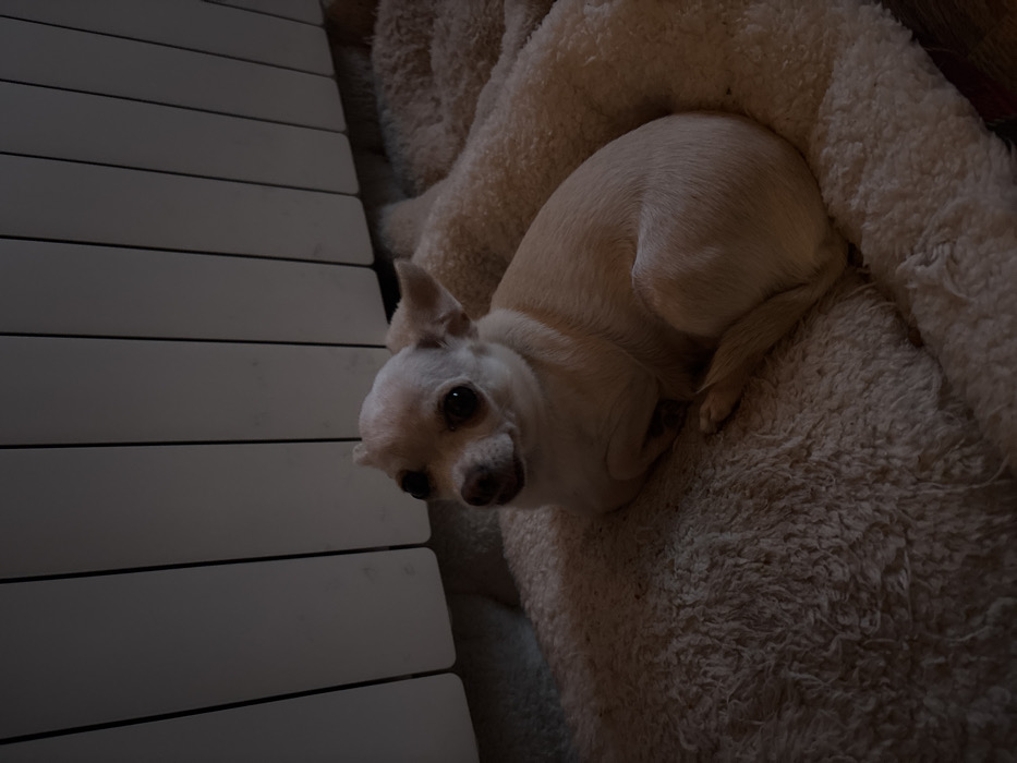 - "An indoor scene in Sofia, Bulgaria, depicts a light-colored, short-haired dog, consistent with a Chihuahua breed, positioned on a beige, shaggy pet bed" by FM-HrwM43, licensed under CC BY 4.0