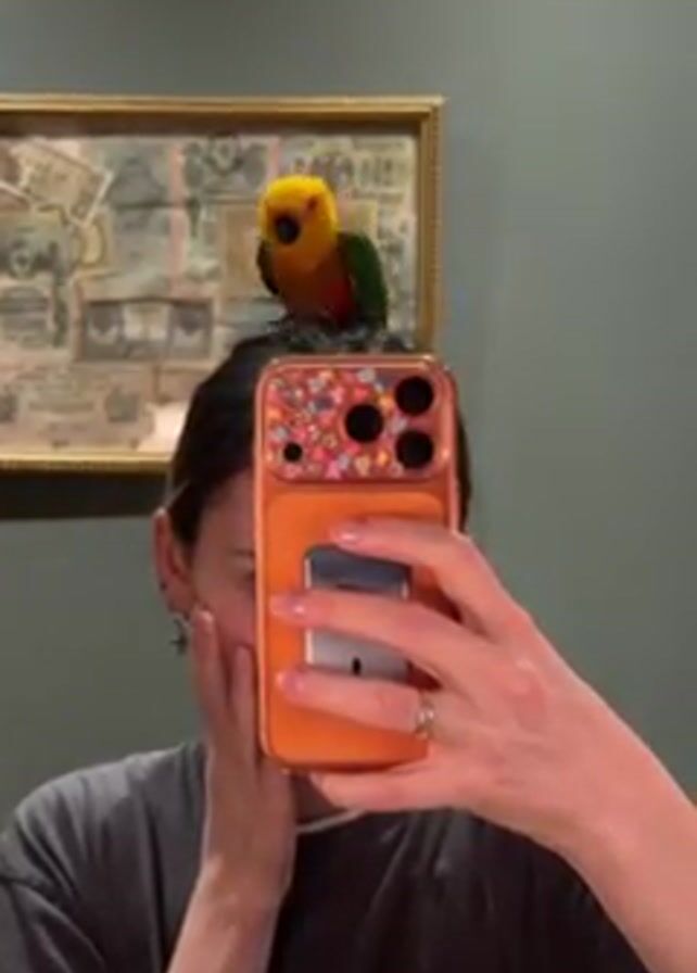A woman is holding her orange cellphone in front of her to take a selfie. A parrot sits on the top of her head, seemingly stuck in her bun. The woman is asking for help to get the bird unstuck. The background includes a painting and a teal-colored wall.