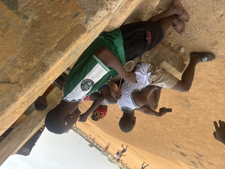 The image depicts an outdoor scene in the City of Television, Nigeria. In the immediate foreground, a rough, light brown wall or structure runs vertically along the right side, exhibiting visible wear and texture. Three males are prominently positioned against this structure. The individual closest to the viewer, squatting on the left, is dark-skinned with short hair. He wears a white sleeveless jersey featuring "JORDAN" text on the back with green trim, light brown shorts, and black slide sandals with a white circular logo (possibly Chanel). He holds a dark smartphone in his right hand and has white wired earbuds in his ears. To his right, a second dark-skinned male stands or leans, wearing a green and white striped Nigerian national football team jersey (with "NIGERIA FOOTBALL ASSOCIATION" and a Nike swoosh logo), black shorts with a red graphic (appears to be a stylized cross or tribal symbol) on the left thigh, and brown leather slide sandals. He also has white wired earbuds, one visible in his right ear. Partially obscured behind and above these two, a third dark-skinned male is visible, wearing an orange shirt and looking towards the left. A fourth individual's head is barely visible above the wall in the upper right background. The expansive background, visible to the left beyond the wall, reveals a large, open reddish-brown dirt field. Several distant, indistinct figures are actively engaged on the field, indicative of a football game or practice in progress. Low-rise buildings and a perimeter fence are discernible along the distant horizon under an overcast, light grey sky. The overall environment appears dry and dusty.