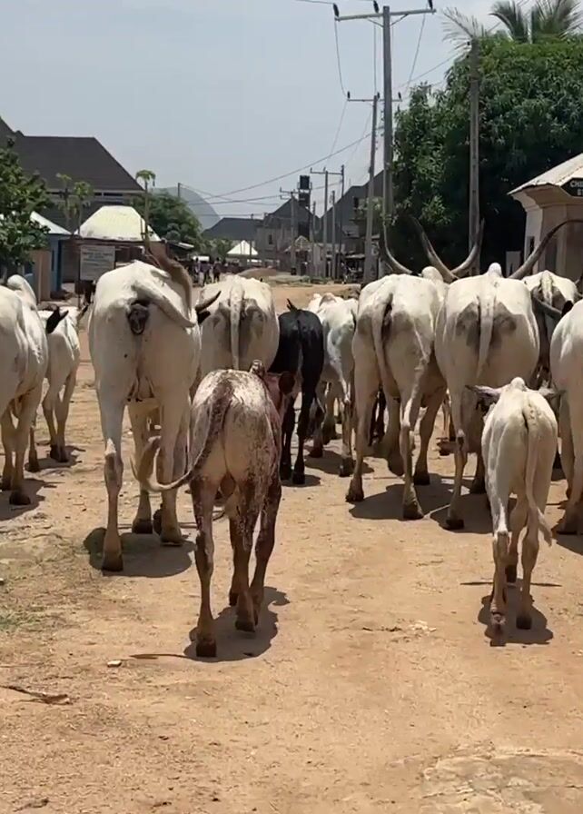 - "A herd of white cattle is walking down a dirt road in what appears to be a residential area" by FM-NPa503, licensed under CC BY 4.0